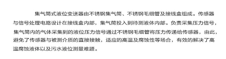 集氣桶式液位變送器(下稱變送器)用于測(cè)量較高溫度液體介質(zhì)的液位,原理是被測(cè)液體介質(zhì)壓縮集氣桶內(nèi)的空氣,空氣壓力通過毛細(xì)管傳遞給敏感元件,敏感元件本身不與被測(cè)介質(zhì)直接接觸,因此變送器可以應(yīng)用在較高溫度的介質(zhì)環(huán)境中,同時(shí),內(nèi)置微型信號(hào)放大處理電路,可以直接與計(jì)算機(jī)接口卡、控制儀表、智能儀表或 PLC 等連接,進(jìn)行遠(yuǎn)程傳輸。變送器廣泛應(yīng)用于環(huán)保、水利、供水、工業(yè)過程控制、變頻供水等較高溫度介質(zhì)的液位測(cè)量。